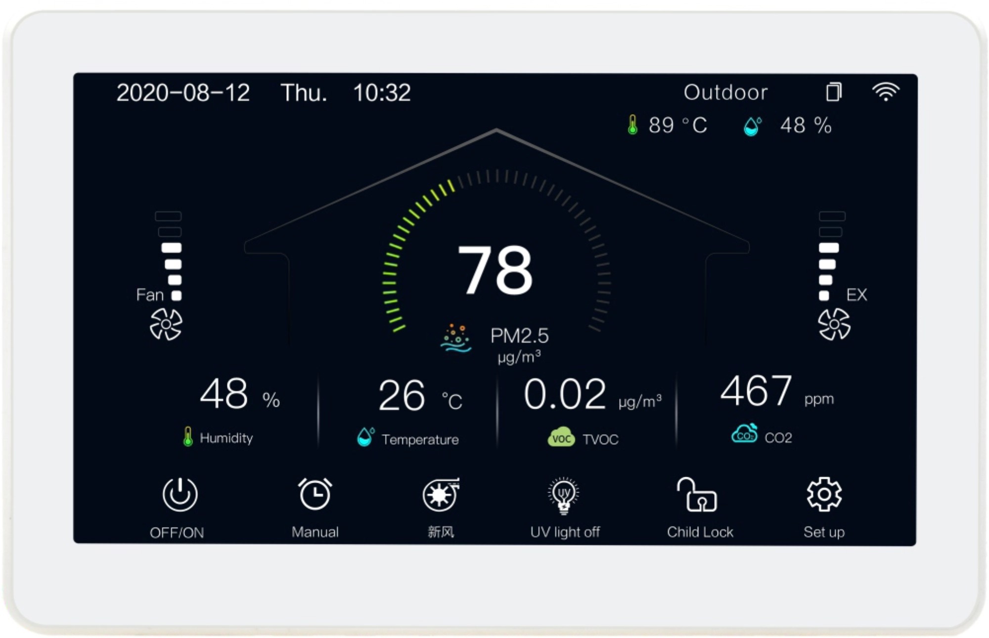 Hiển thị thời gian thực: Nhiệt độ, độ ẩm trong nhà, liên kết không khí tươi, hút ẩm, PM2.5, PM10.