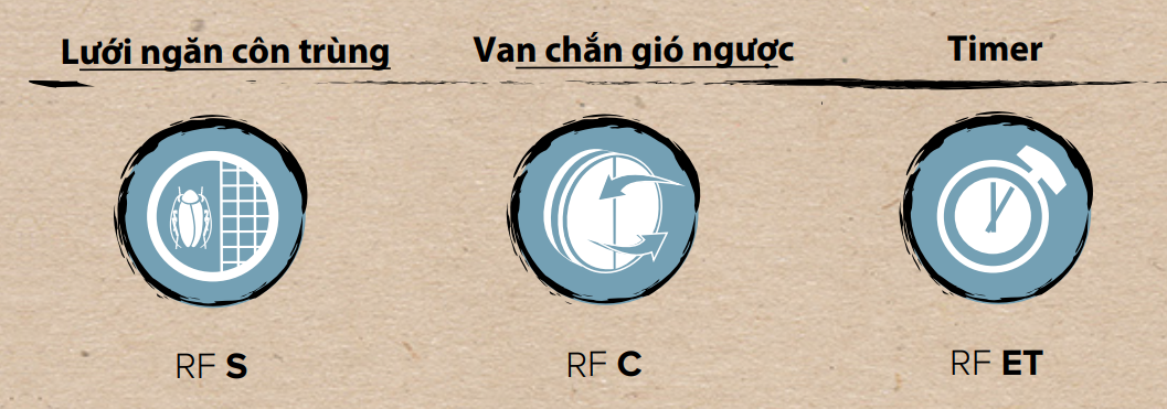 Quạt hút trục loạt RF có 4 kích cỡ cho ống dẫn có đường kính bất kỳ. Sản phẩm có thể hoạt động trong cả ống xả và ống cấp khí tùy thuốc vào việc lắp đặt. Một số model được trang bị hộ hẹn giờ, van chống gió ngược và lưới chống muỗi. Quạt được đặc trưng trong một thiết kế hợp thời trang với của chớp xuyên tâm.