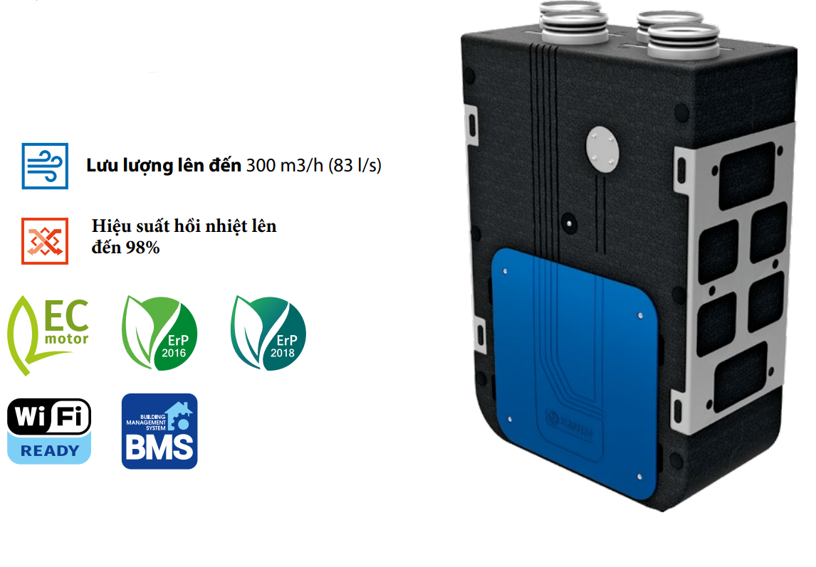 - Công nghệ thu hồi nhiệt và độ ẩm giúp giảm tổn thất nhiệt sưởi trong mùa lạnh và giảm tải cho máy điều hòa không khí khi mùa nóng trong suối quá trình thông gió.