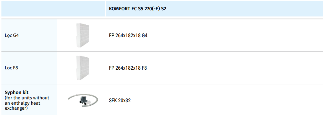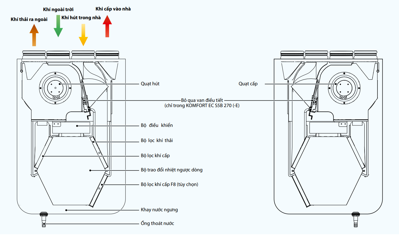 - Thiết bị KOMFORT EC S5B 270 được trang bị bộ trao đổi nhiệt polystyrene ngược dòng dạng tấm để thu hồi nhiệt. Nước ngưng tụ của thiết bị được thu gom và thoát vào khay thoát nước dưới bộ trao đổi nhiệt.