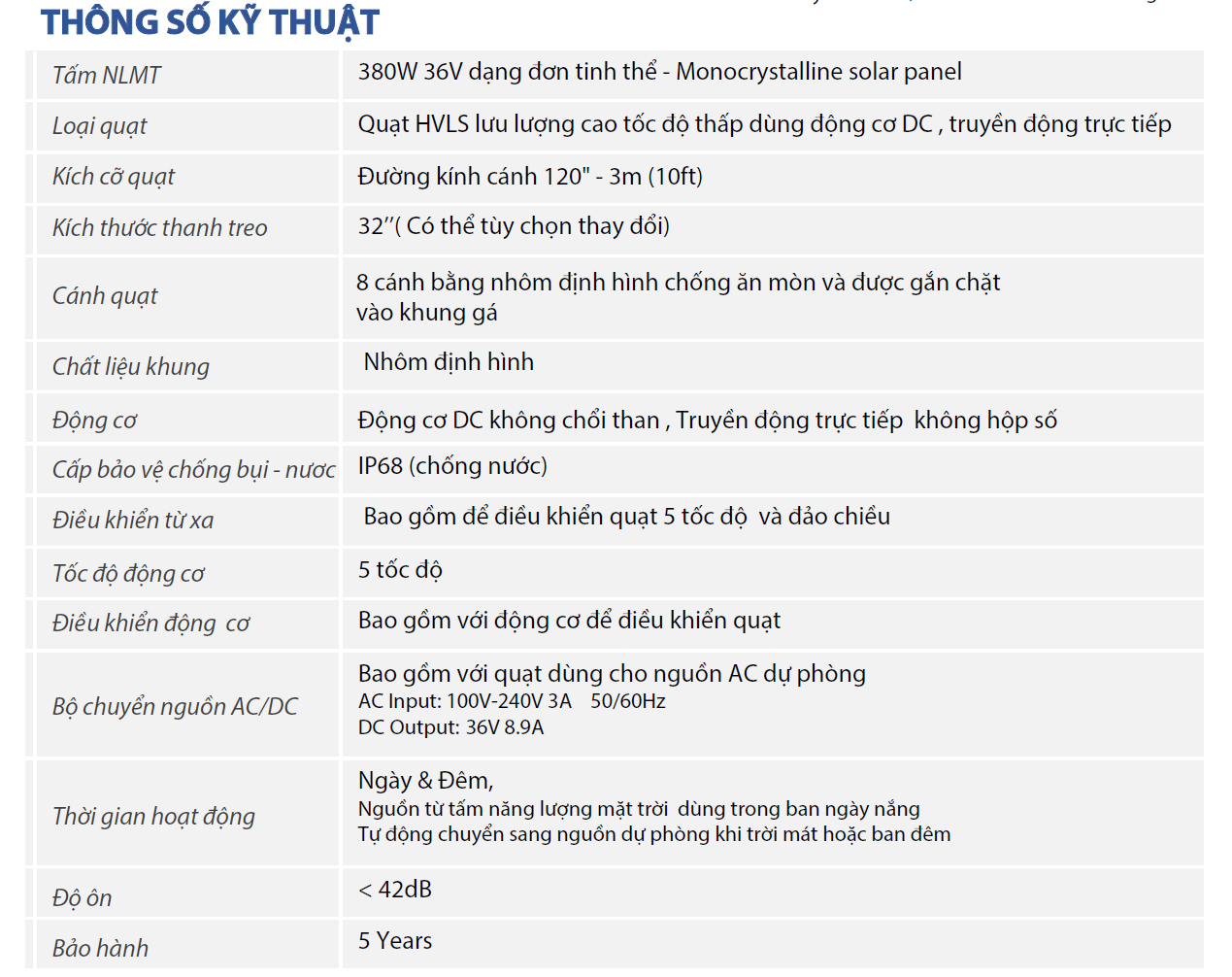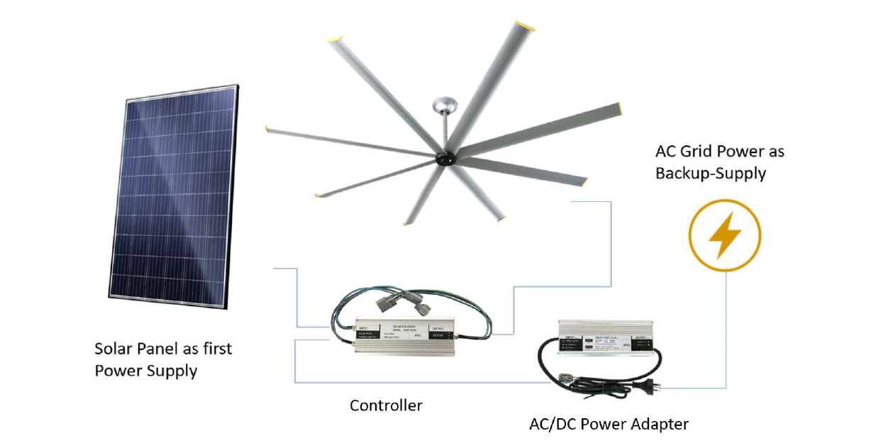 Quạt trần lớn HVLS (lưu lượng lớn, tốc độ thấp) thế hệ mới sử dụng nguồn điện từ năng lượng mặt trời và cũng được thiết kế sử dụng nguồn điện từ lưới điện nhà, tính năng dạng hỗn hợp (hybird). Quạt hoạt động trực tiếp bằng động cơ DC không chổi than cấp cao nhất, đây là một giải pháp cách mạng mới về giảm thiểu tối đa chi phí thông gió, làm mát hoặc chống ẩm để thu hồi khoản đầu tư của bạn với số tiền tiết kiệm được!