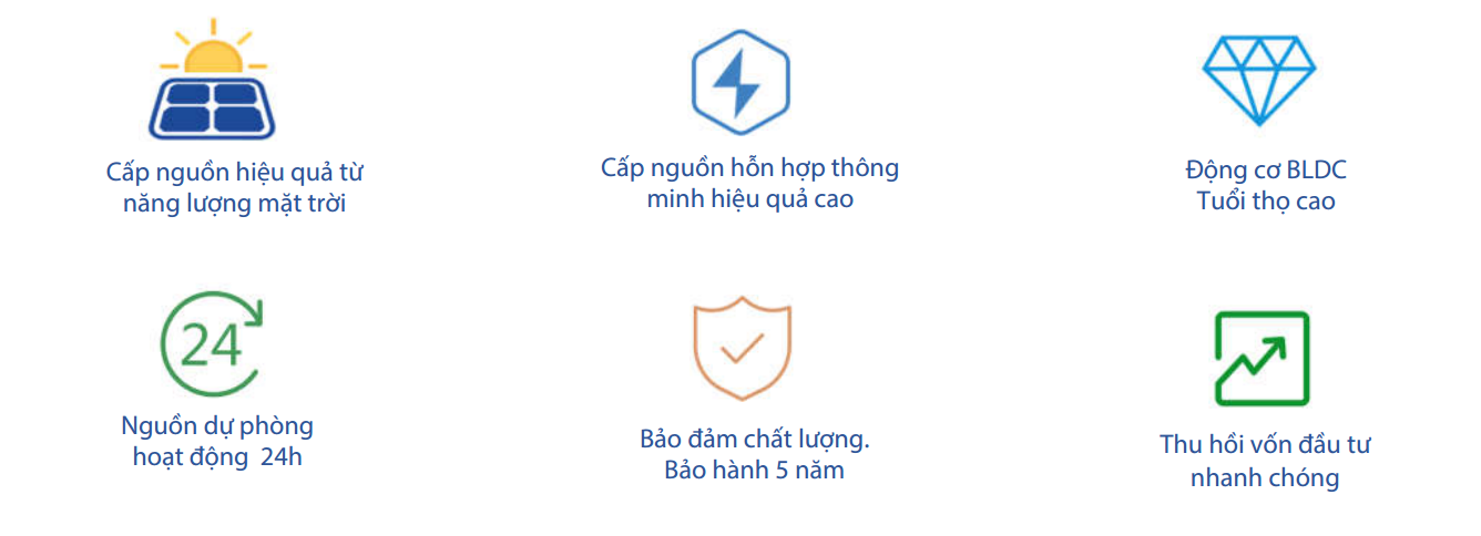 • Nguồn điện hỗn hợp Hybird (NLMT & Điện lưới), tự động chuyển đổi cho hoạt động 24h, tiết kiệm đến 60% chi phí điện ngay cả khi sử dụng điện lưới
